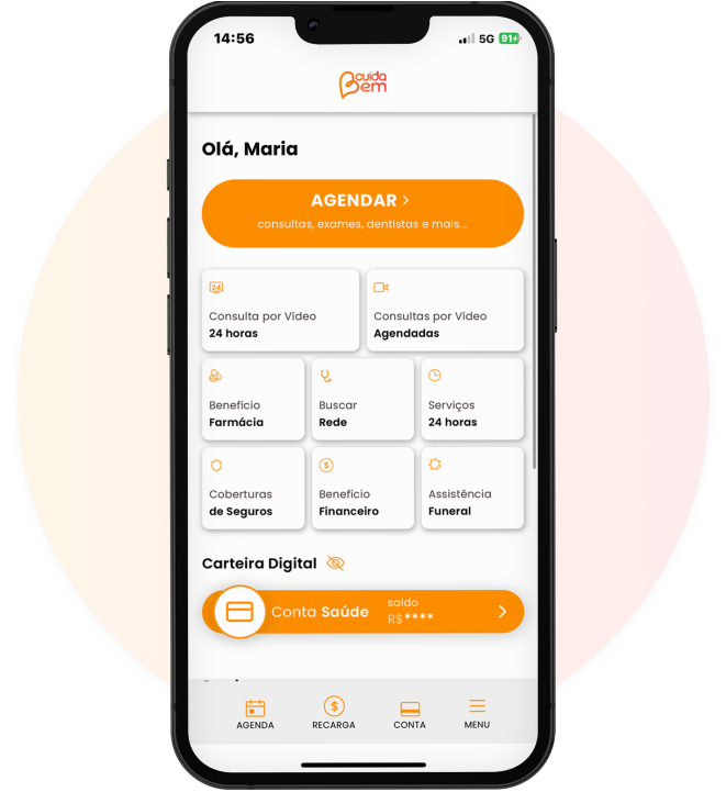 Faça a recarga da sua Conta Saúde acessando a plataforma Cuida Bem, ou ligue na Central de Atendimento nos números 11 4000 1640 (capitais e regiões) ou 0800 836 8836 (demais localidades).