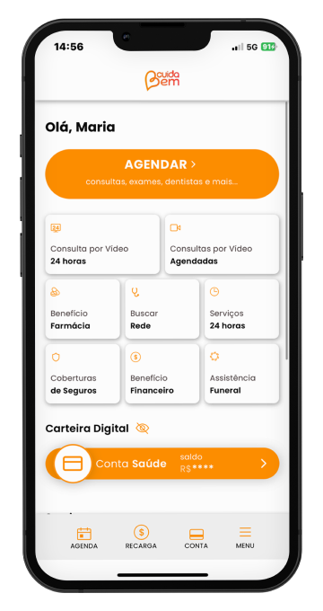 Faça a recarga da sua Conta Saúde acessando a plataforma Cuida Bem, ou ligue na Central de Atendimento nos números 11 4000 1640 (capitais e regiões) ou 0800 836 8836 (demais localidades).